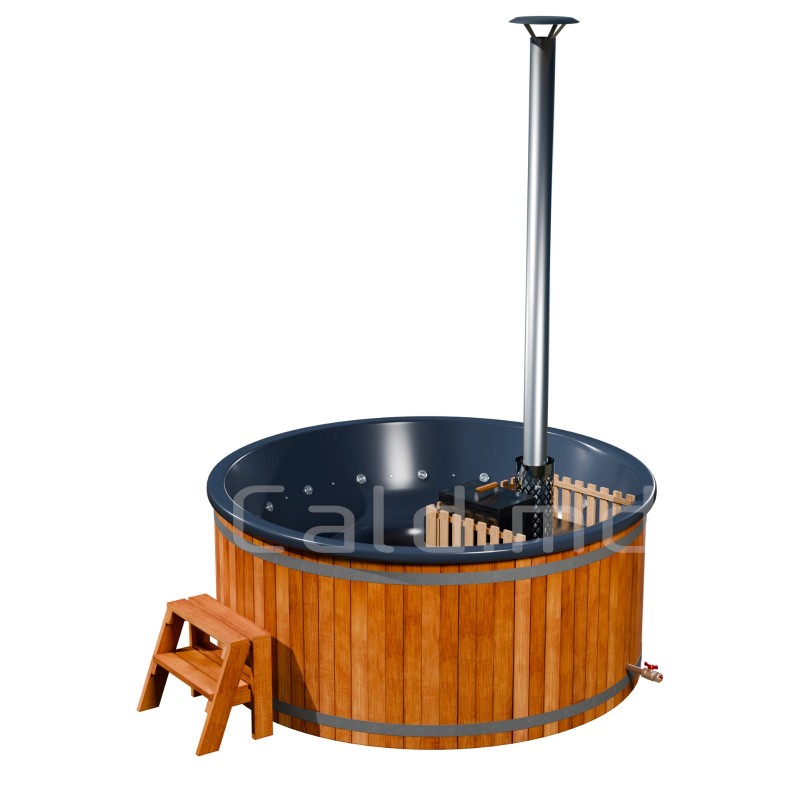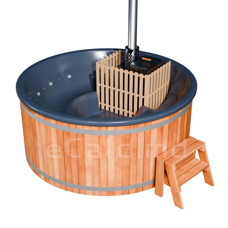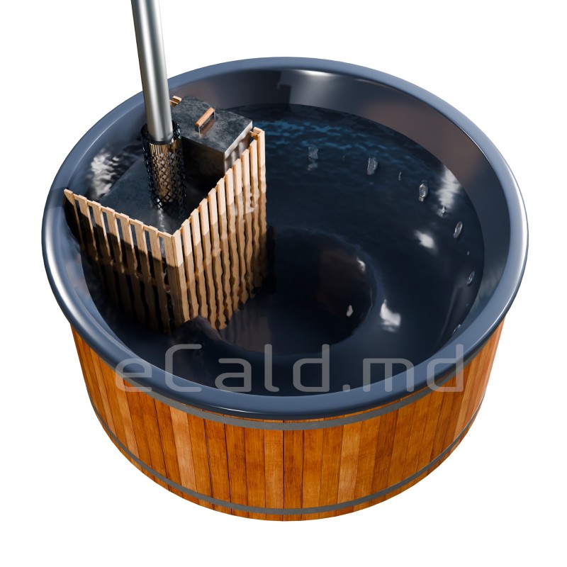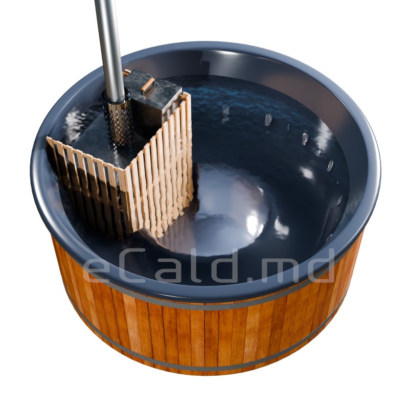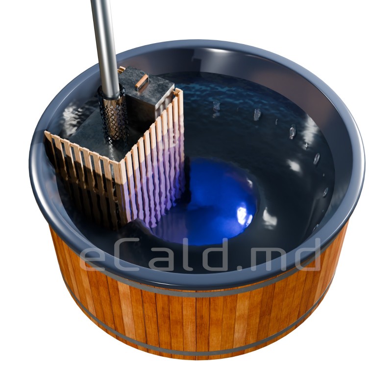 Dotari standard: Soba incorporata 22kw ,cos de fum Rama perimetrala din lemn, Lambriu tratat termic Capacitate 4-6persoane (4 adulti 2 copii) Volum 1250 L Timp de incalzire 8 - 40C 1,5-2 ore cu soba interna pe lemne Diametrul extern 2 m Diametru intern 1.8m Inaltime 1 m Greutate 200kg Sistem aeromasaj 12 duze 750w Iluminare led (RGB) 10 buc, 7 culori Izolatie cu spuma poliuretanica *Capac izolat (se procura individual) *Nu este recomandat folosirea a apei sarate