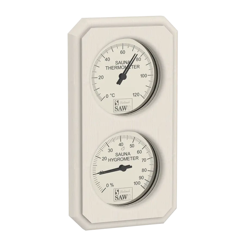 Термогигрометр 221-THVA от компании Sawo имеет оригинальную прямоугольную форму и вертикальную ориентацию. В широкой рамке из древесины осины находится два круглых окошка. Под стеклом каждого окошка расположен графичный циферблат. Один из них - это гигрометр, который с точностью измерит уровень влажности в парной, другой - термометр, который сообщит о температуре воздуха. Данный прибор прекрасно подойдёт для использования в любом парильном помещении. В нашем интернет-магазине представлен широкий ассортимент измерительных приборов в корпусах из разных видов древесины. Вы можете купить по привлекательной цене модель 221-THVA или присмотреться к другим вариантам.