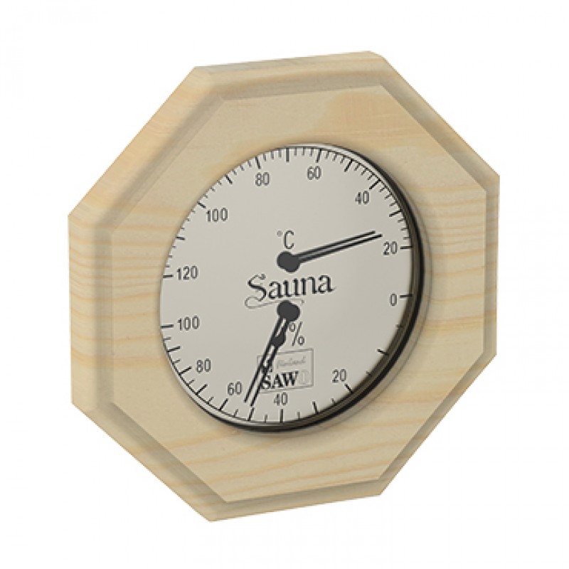 Термогигрометр 241-THР от компании Sawo имеет оригинальную форму равностороннего восьмигранника. В широкой рамке из древесины сосны находится большой, круглый, графичный циферблат. Циферблат разделён на две шкалы. Одна из них - это гигрометр, который с точностью измерит уровень влажности, другая - термометр, который сообщит о температуре воздуха. Данный прибор прекрасно подойдёт для использования в парной. Благодаря универсальному дизайну он станет прекрасным дополнением любого интерьера. В нашем интернет-магазине представлен широкий ассортимент измерительных приборов в корпусах из разных видов древесины. Вы можете купить по привлекательной цене модель 241-THР или присмотреться к другим вариантам.
