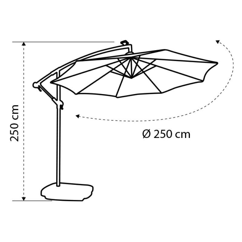 Cadrul de oțel al umbrelei, acoperit cu vopsea epoxidică, garantează o durabilitate ridicată și rezistență la intemperii. Materialul impermeabil de 250 g/m² este tratat împotriva razelor UV și dispune de un ax de ventilație. Un sistem de deschidere acționat de o manivelă asigură ușurința în utilizare.